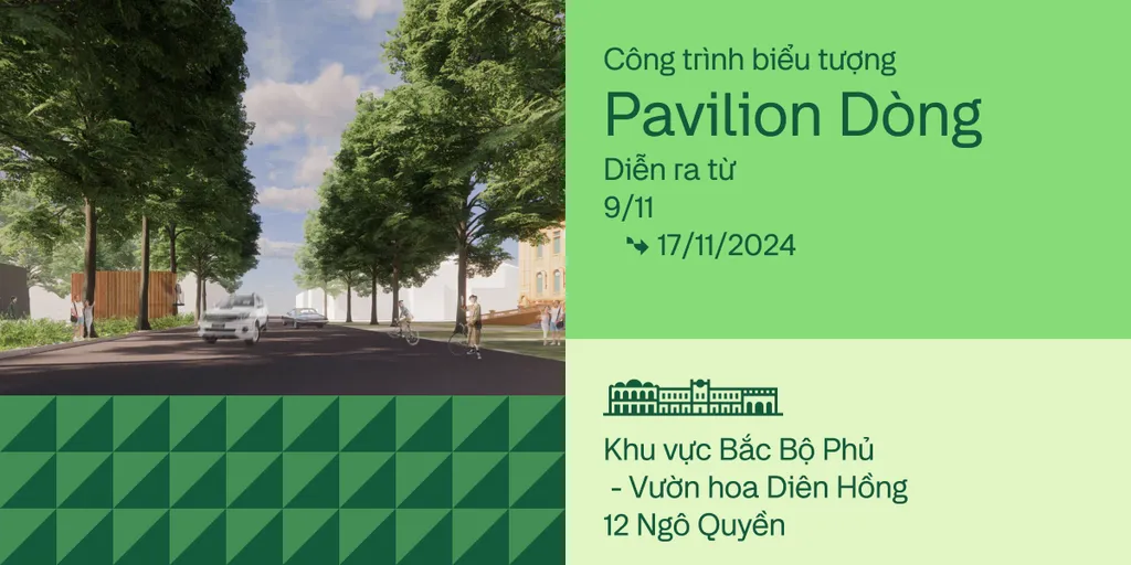 Pavilion DÒNG bao gồm 2 pavilion đưa công chúng đi từ một không gian “mở” (Vườn hoa Diên Hồng) đến không gian “đóng” (bên trong Bắc Bộ Phủ), và điểm kết của tuyến là một khu vườn nghệ thuật để người xem cảm nhận sự kết nối 2 Pavilion này, tựa như một dòng chảy lịch sử từ di sản tới hiện tại.