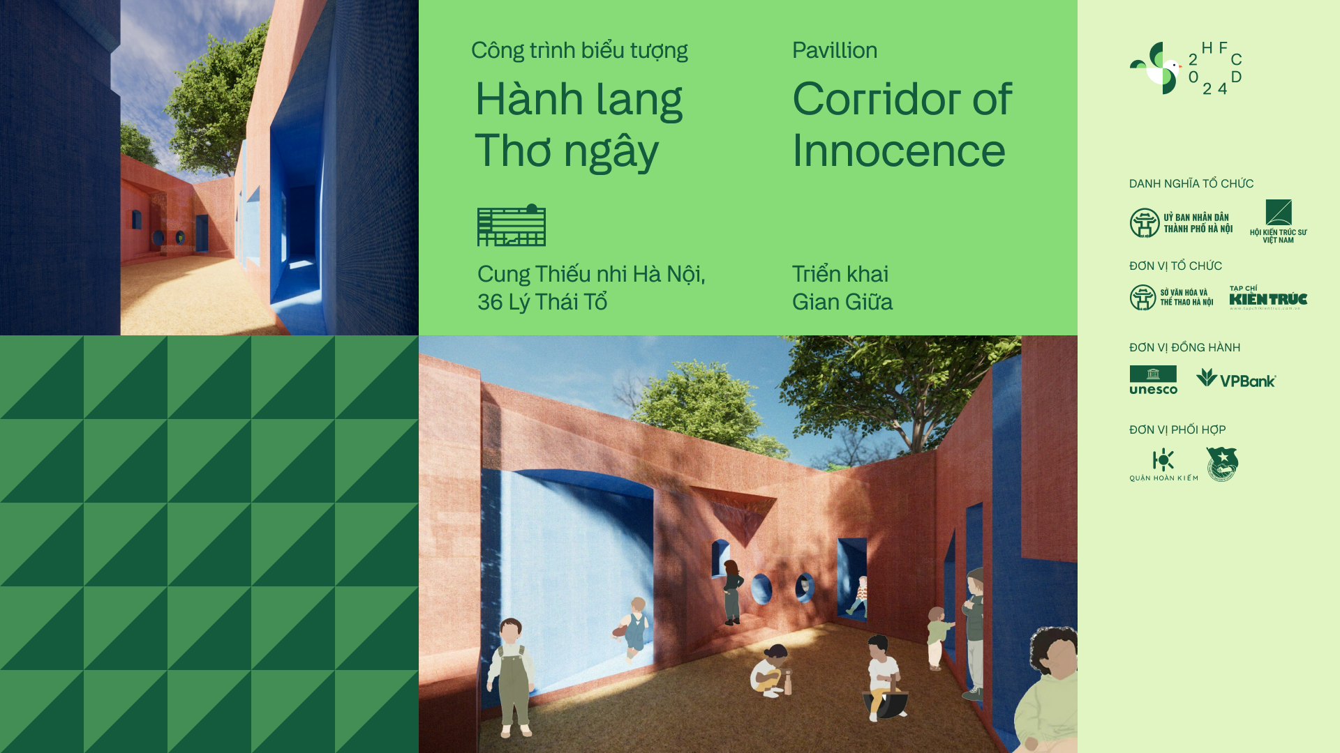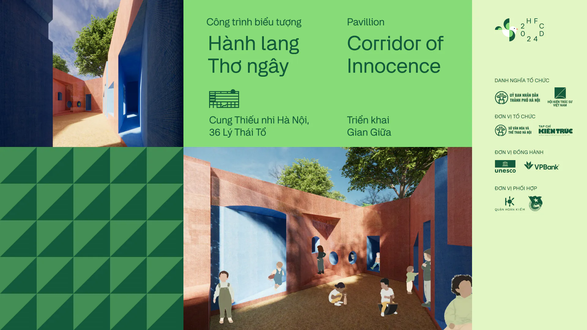 The Corridor of Innocence draws inspiration from "Ấu Trĩ Viên," the French kindergarten built from the colonial era, which features French-style buildings within the palace. The design of the pavilion creates the illusion of endless hallways connecting the old French architecture with the new structures, extending into common courtyards, out of the palace, and linking with key festival locations. The pavilion features multiple small hallways, acting as playgrounds for both children and adults, fostering intergenerational interaction, learning, and connection. It symbolizes growth and the continuation of memories across generations.
