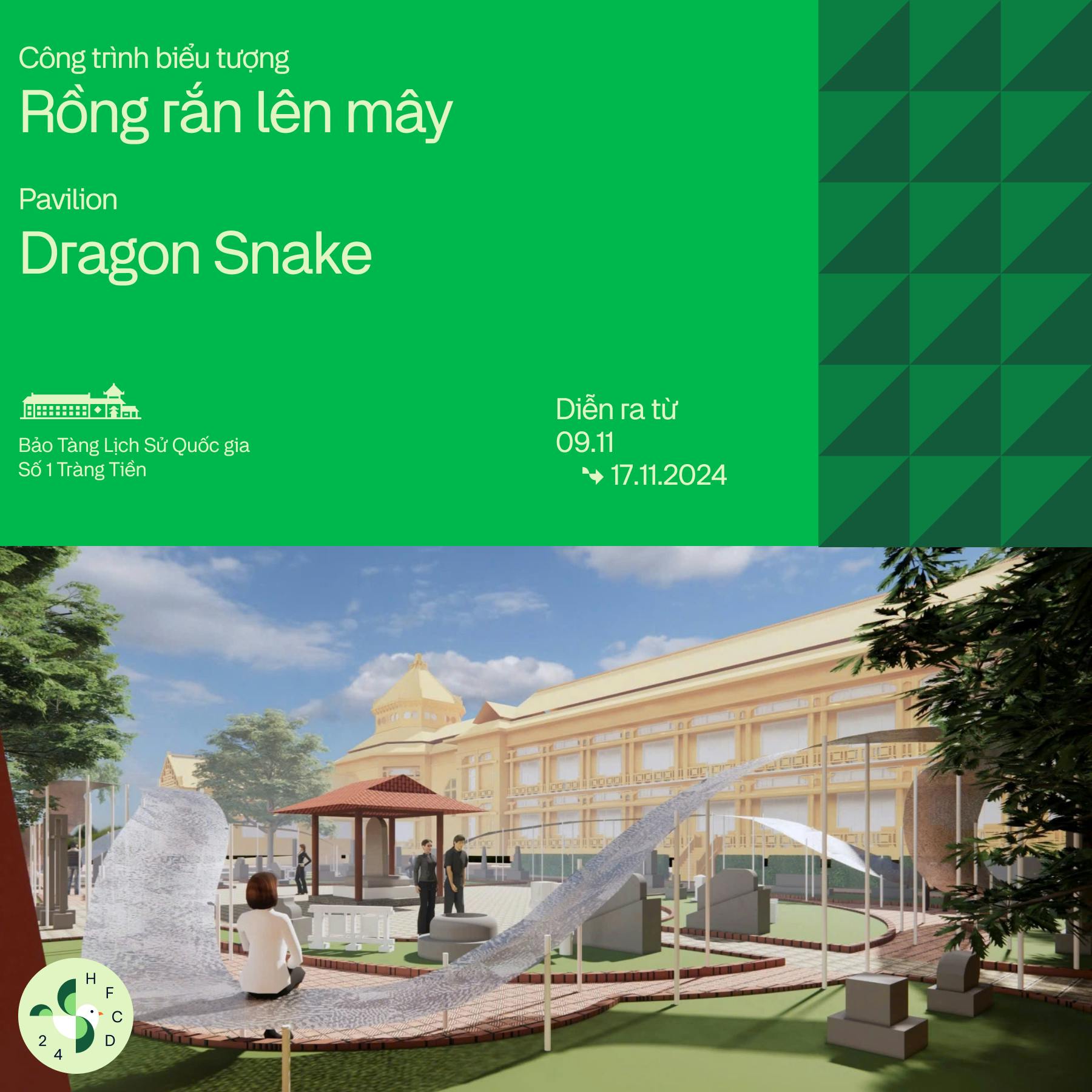 Tên gọi Rồng rắn lên mây xuất phát từ hình thái uốn lượn của công trình, là một sự liên tưởng tới trò chơi dân gian có vẻ ít nhiều đã bị lãng quên ở hiện tại. Bằng cách thiết kế và đặt tên này, các KTS vừa mong muốn đem đến một sự uyển chuyển hài hòa về không gian, vừa mong muốn khơi gợi sự thích thú vui chơi và tìm tòi của những thế hệ trẻ, từ đó liên kết với công trình di sản và kho tàng lịch sử đang được lưu trữ và trưng bày trong Bảo tàng Lịch sử Quốc gia. Xen kẽ trong không gian Rồng Rắn lên mây là các tác phẩm sắp đặt “Tỷ lệ có phải là vấn đề?” trưng bày các mô hình công trình Bảo tàng Lịch sử Quốc gia ở các tỷ lệ khác nhau từ 1:20000 tới 1:75 và bằng các chất liệu khác nhau. Người tham gia có thể nhìn ngắm và khám phá dáng vẻ của công trình từ nhiều góc độ để hiểu biết sâu sắc hơn về lịch sử và phong cách kiến trúc của Bảo tàng.