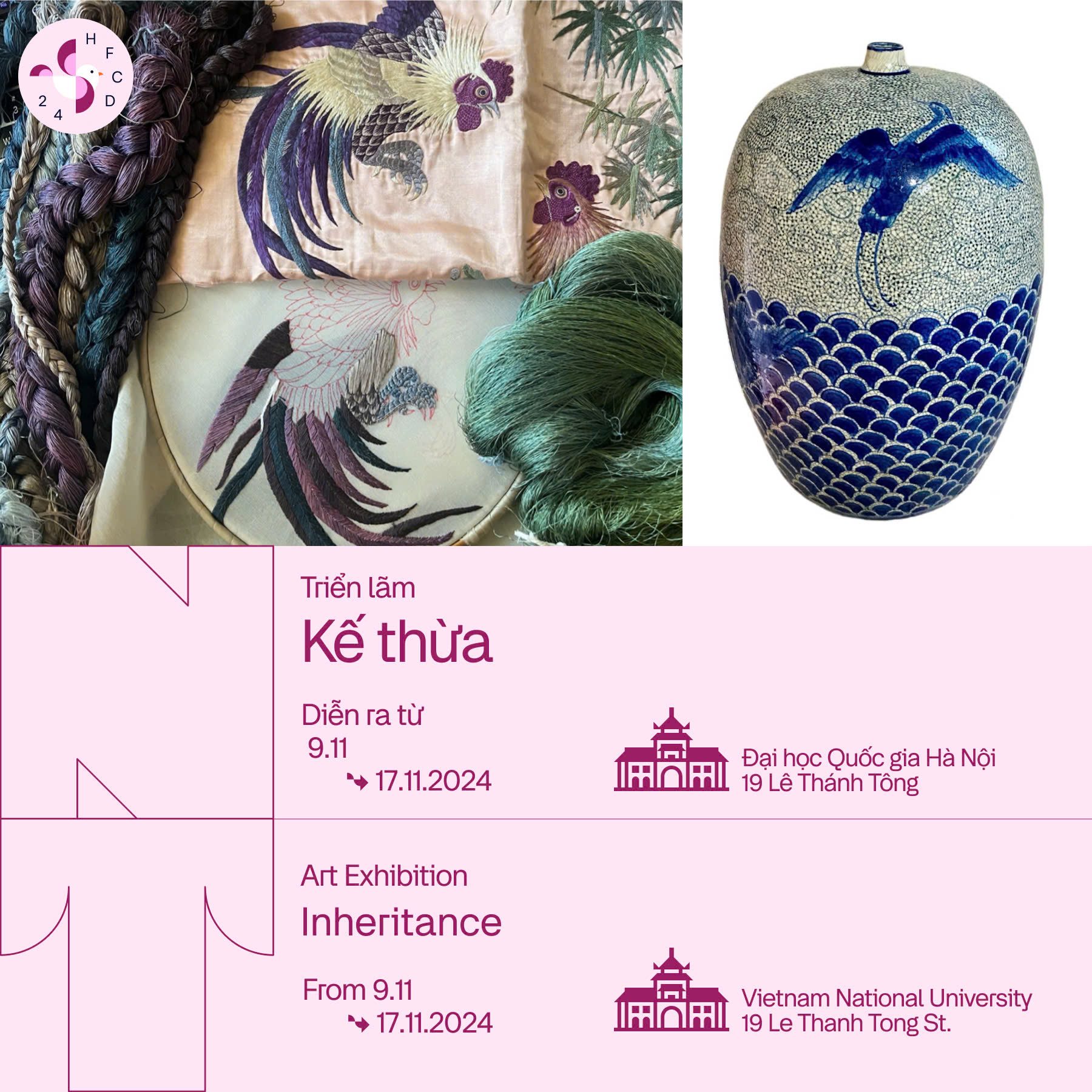 In the hallway on the ground floor, before ascending the ancient stairs, there is an exhibition showcasing the results of artist Pham Ngoc Tram's research, collection, and experimentation with Vietnamese embroidery heritage from the Indochina period. The unique feature of Indochina embroidery is its rich indigenous materials. Silk and silk threads from craft villages in the delta region, hand-dyed color palettes made from natural materials such as leaves, tubers, and roots of local plants, along with traditional dyeing techniques and compositions, create color harmonies that vividly express the consciousness, aesthetics, and rich soul of Vietnamese culture.