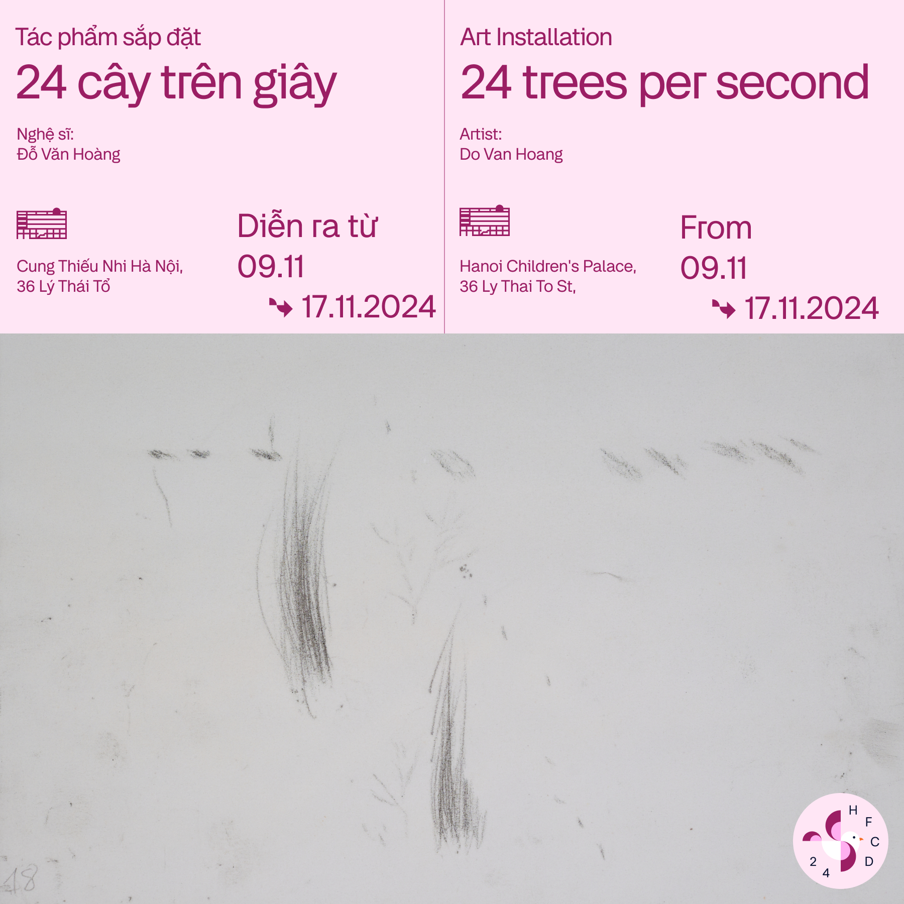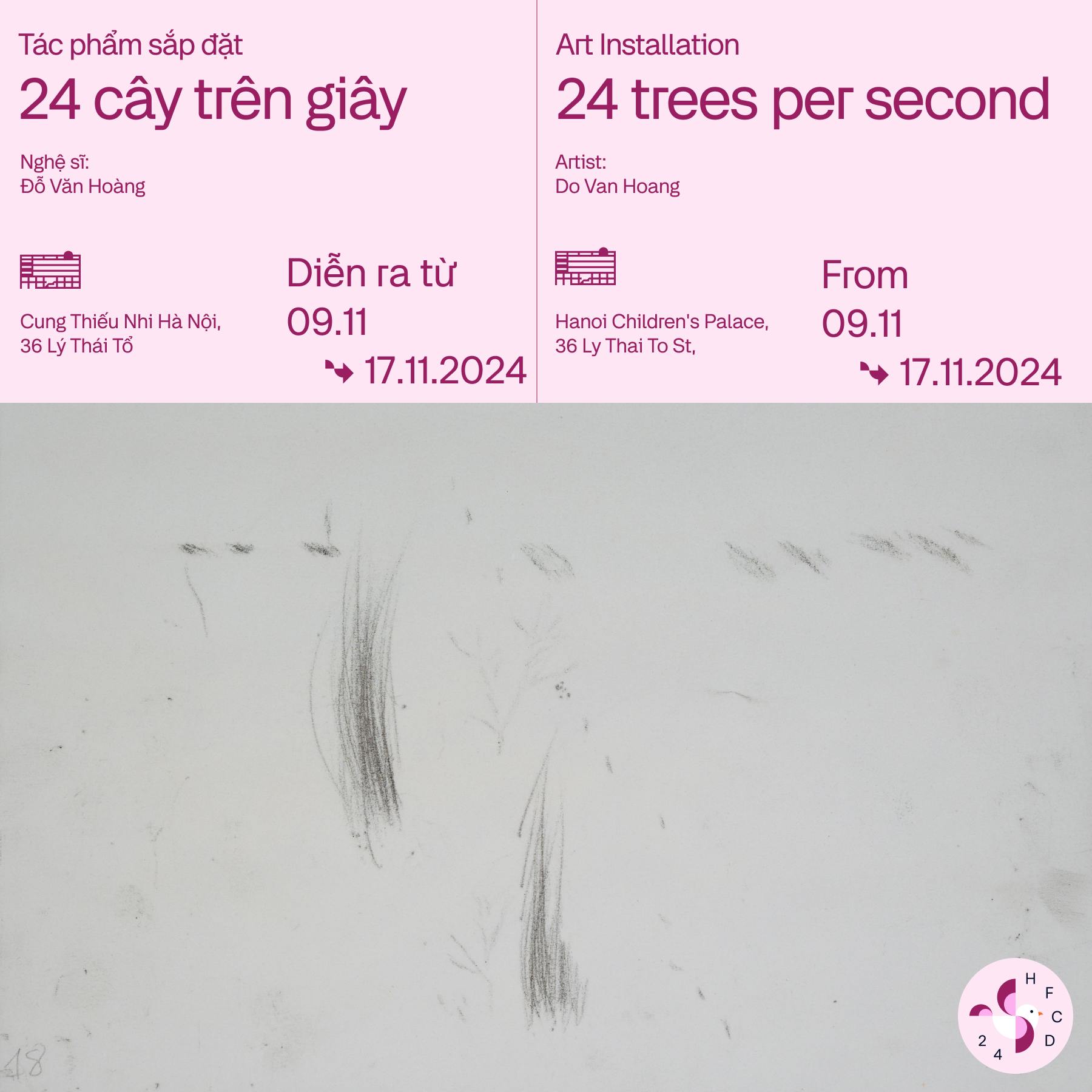 “24 cây trên giây” là tác phẩm sắp đặt của Đỗ Văn Hoàng, được lấy cảm hứng từ thế giới hình ảnh đầy tính ngụ ngôn và trong trẻo nên thơ của đạo diễn Abbas Kiarostami. Tái cấu trúc và tiếp biến các bức ảnh trong cuốn sách Snow White (tạm dịch: Tuyết trắng) của Abbas, Đỗ Văn Hoàng chuyển hoá những bức hình của đạo diễn người Iran và dàn dựng chúng thành hành trình đi qua những miền phong cảnh. Diễn ra trong tại Cung Thiếu nhi Hà Nội từ 8h30-17h các ngày trong tuần và 8h30-21h các ngày thứ Bảy và Chủ nhật, tác phẩm sắp đặt 24 cây trên giây hứa hẹn là hoạt động thú vị tại Lễ hội Thiết kế Sáng tạo Hà Nội 2024.