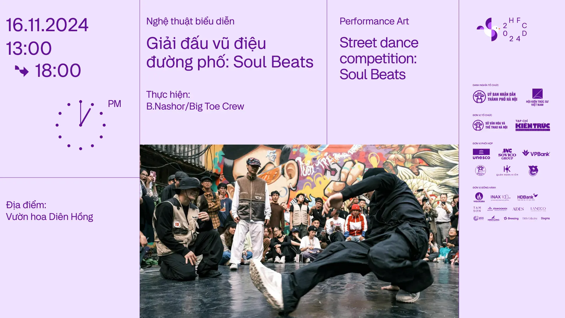 Explode with energy at the Soul Beats Street Dance Competition, happening from 1 PM to 6 PM on November 16, 2024, at Dien Hong Garden , Hoan Kiem, Hanoi.