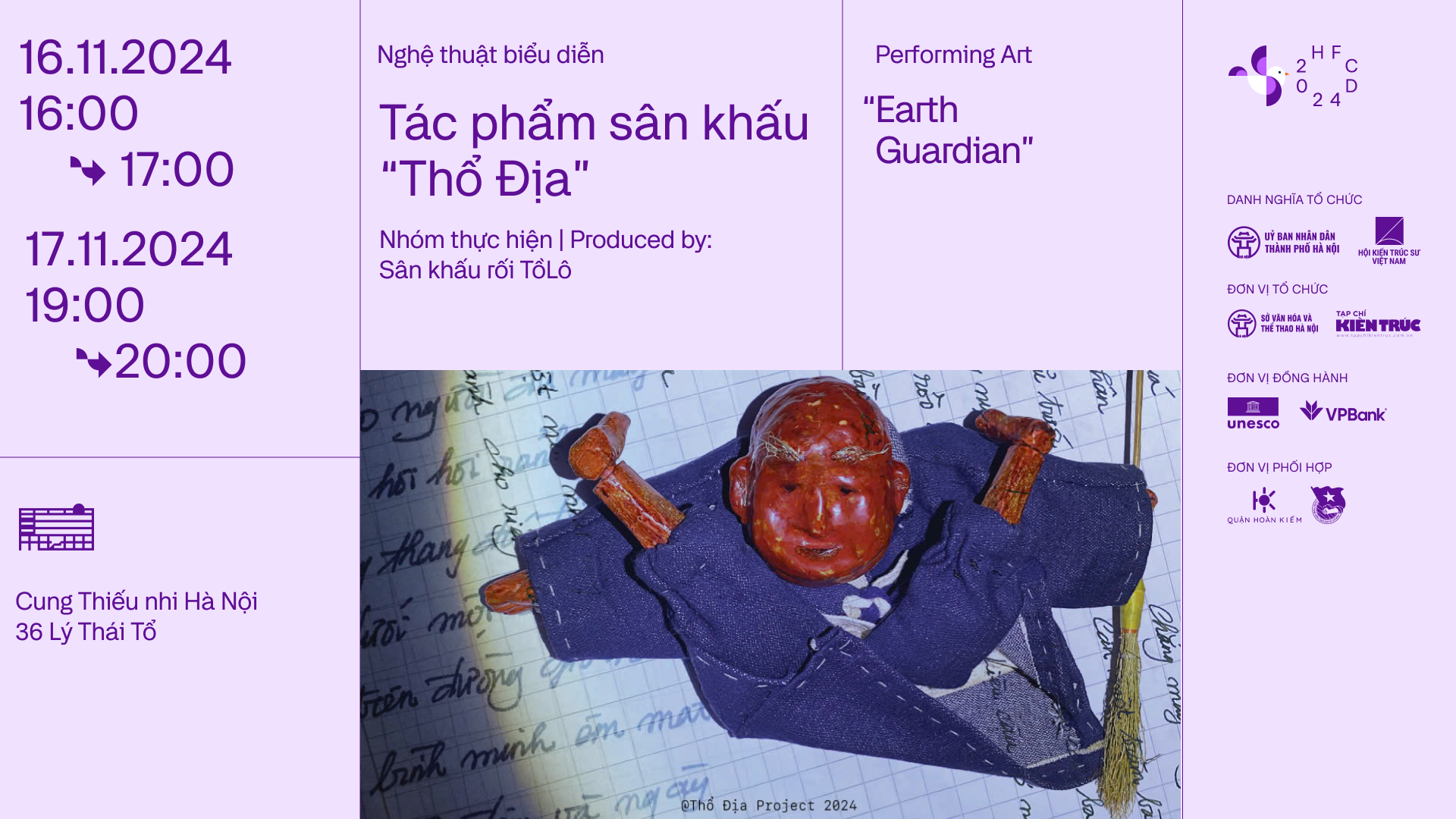 Dự Án Thổ Địa là tác phẩm sân khấu sẽ được trình diễn lần đầu tiên ở Việt Nam tại Rạp Khăn Quàng đỏ, Cung Thiếu nhi Hà Nội trong Lễ hội Thiết kế Sáng tạo Hà Nội 2024. Tác phẩm được xây dựng và triển khai bởi các nghệ sĩ Linh Valerie Phạm, Trần Kim Ngọc, Nguyễn Vũ Hải, Nguyễn Khánh Linh, Huyền M. Hoàng, Lã Thanh Hà, Đào Tùng, Trần Thảo Miên, Phạm Minh Ánh và sản xuất bởi Sân Khấu Rối TồLô.