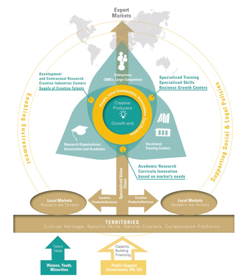 Mô hình Hệ sinh thái sáng tạo (Creative Ecosystem) được đề xuất theo UNIDO không chỉ là một sơ đồ tổ chức mà là một triết lý phát triển tích hợp. Thay vì chỉ tập trung vào lợi nhuận, mô hình này hướng tới sự cân bằng giữa kinh tế, văn hóa và xã hội.