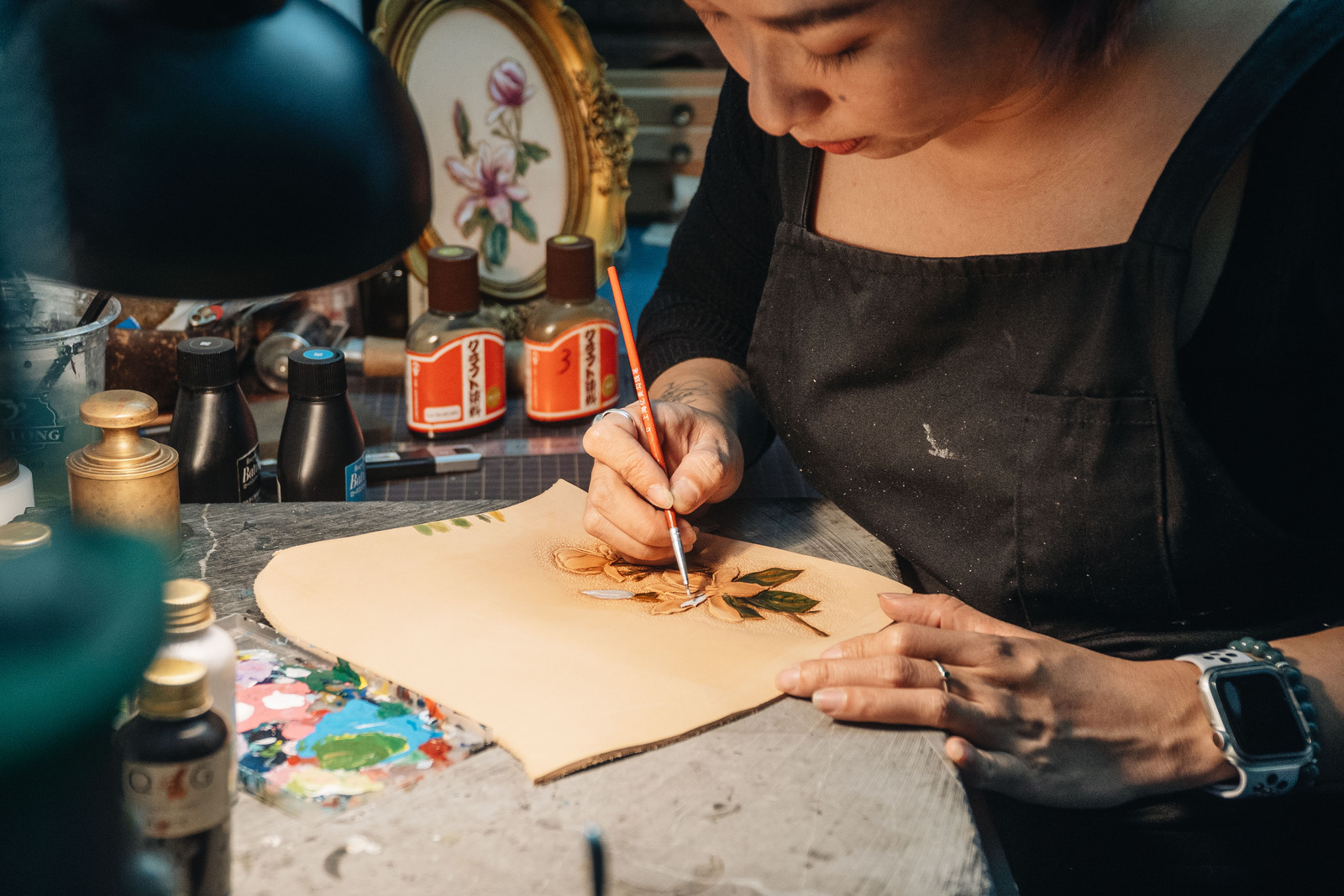 “Điêu khắc trên da” tuy là nghề mới nhưng được nghệ nhân Nguyễn Diệu Linh nâng tầm cho sản phẩm da thủ công quen thuộc, đem lại giá trị cao (Ảnh: VnExpress)